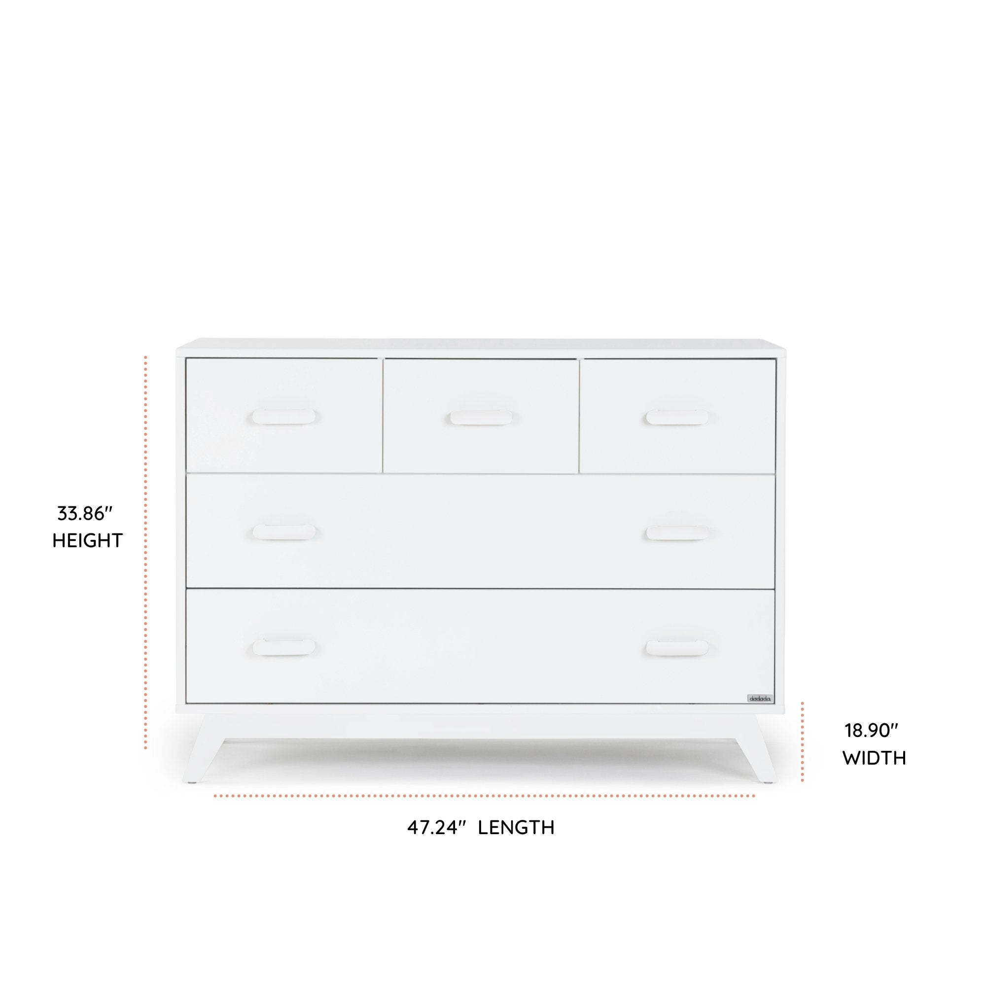The 47” modern Soho 5-drawer Dresser’s classic style pairs perfectly with the Soho 3-in-1 Crib, or adds a pop of mid-century style to any room on its own.